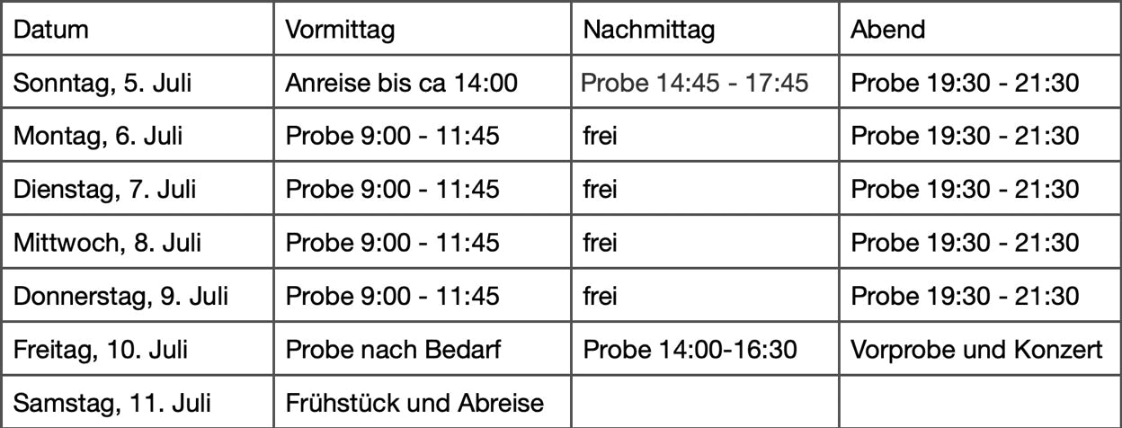 Ausser am Anreisetag proben wir jeden Vormittag und Abend. Am Vormittag wird ausgiebig geprobt, unterbrochen nur durch eine Kaffeepause. Die Abendprobe nach dem Nachtessen ist etwas kürzer. Proben am Nachmittag stehen nicht auf dem Programm, können aber ausnahmsweise nach Bedarf zusätzlich angesetzt werden.