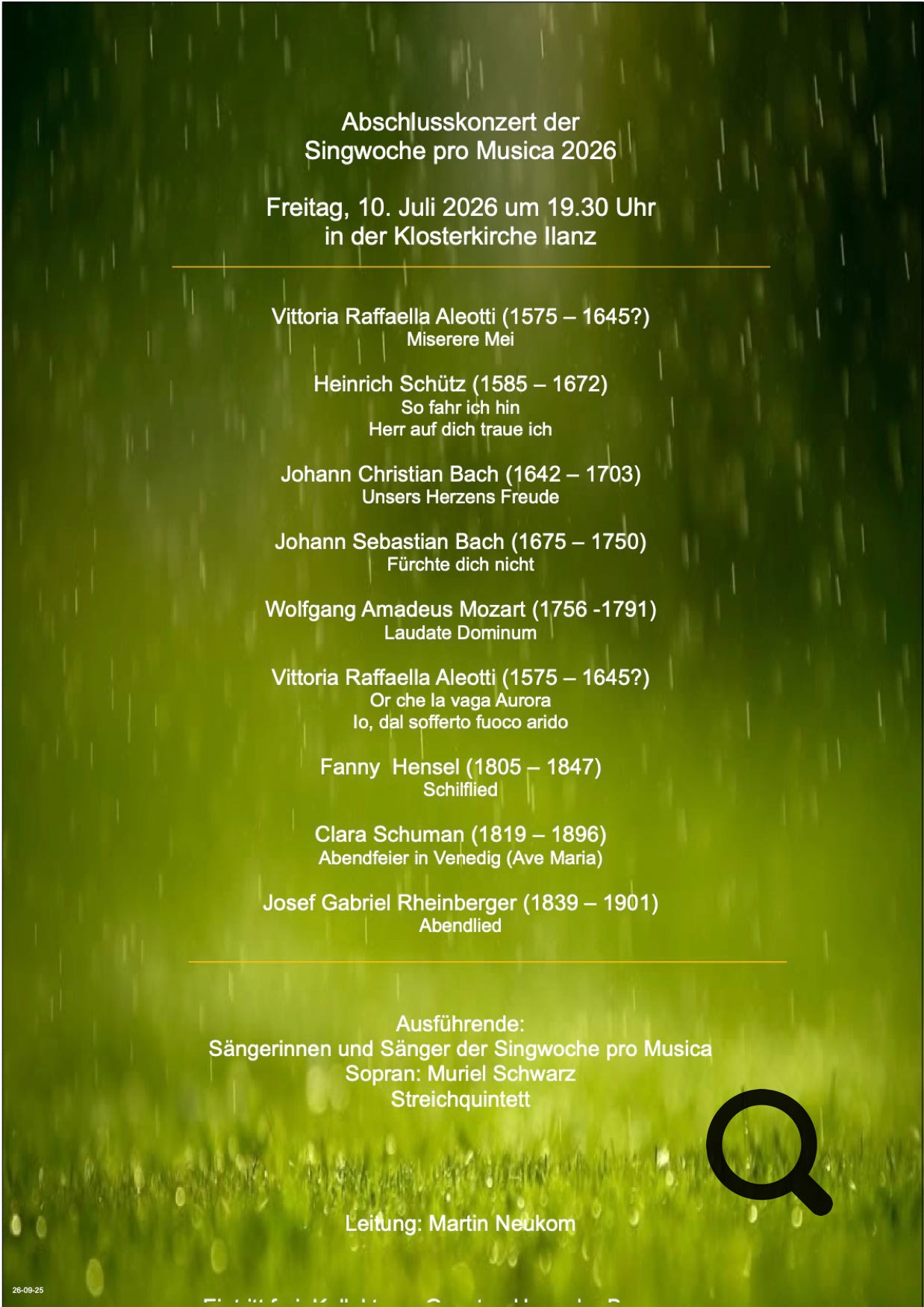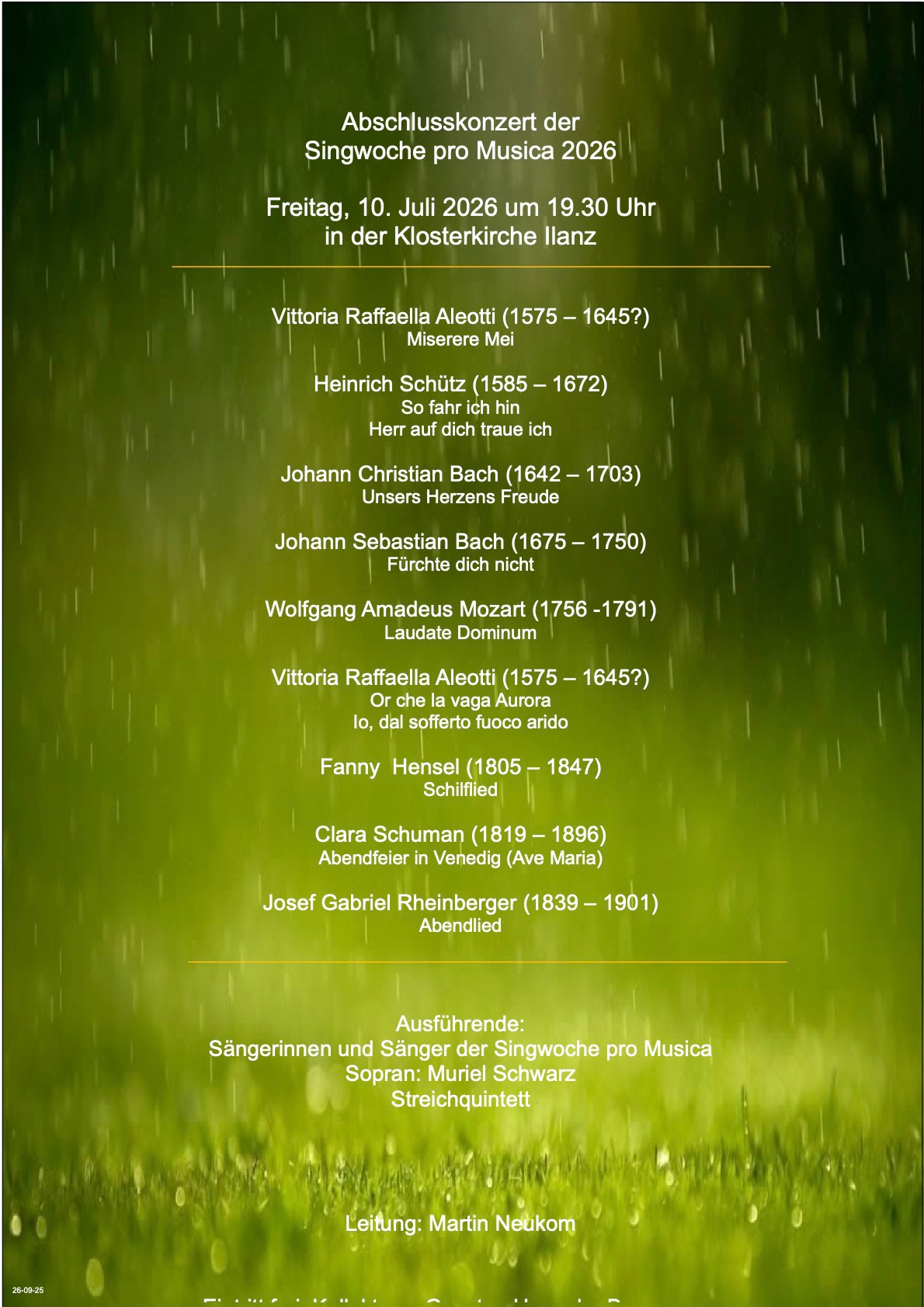 Wir werden die erarbeiteten Werke am Freitag, 10. Juli 2026 um 19:00 in der Klosterkirche als Schlusskonzert aufführen.